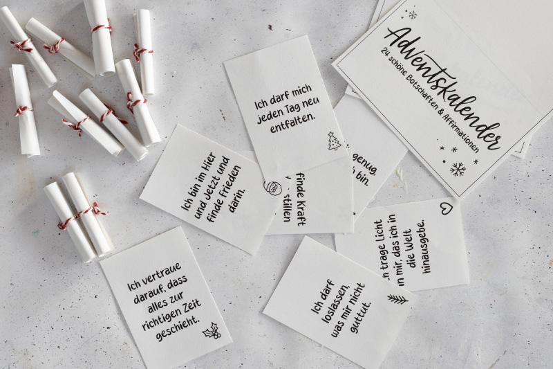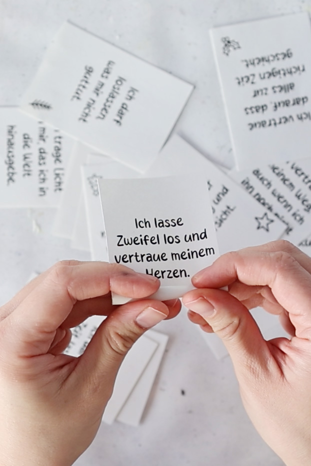 Zum Gestalten von einem Lose Adventskalender und mit 24 Affirmationen und positiven Sprüchen, passend als Mini Adventskalender. Du kannst diese schönen Botschaften ausdrucken und dadurch einen schnellen Weihnachtskalender umsetzen.