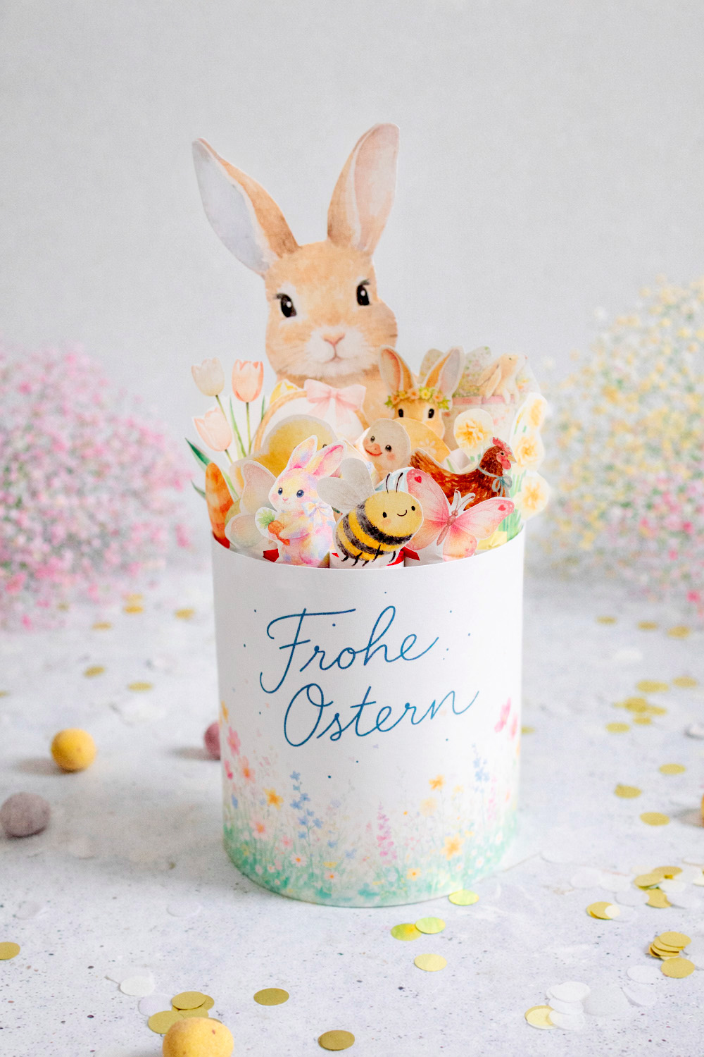 2 Osterhasen-Hintergründe mit Titel „Kauf dir was Schönes“ und einer Blanko-Vorlage