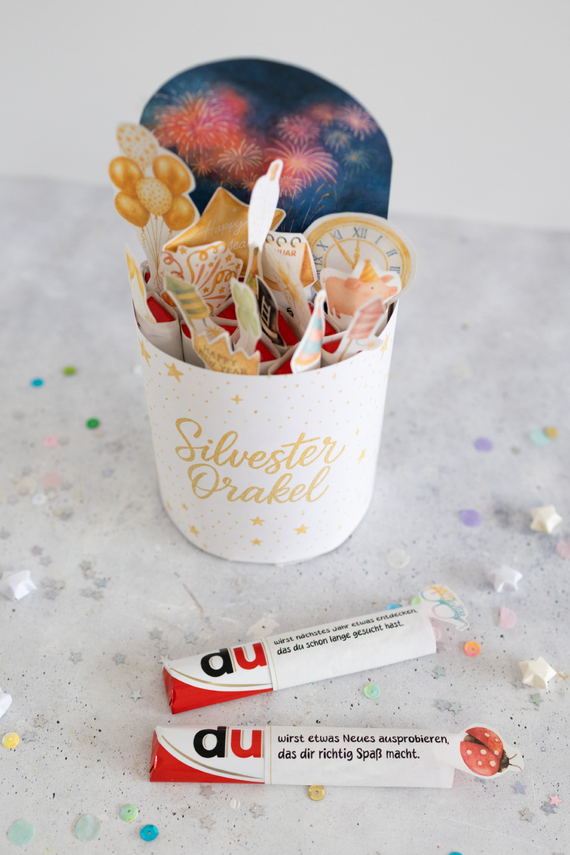 Zum Gestalten von einer Duplo Verpackung und Riegeln mit Sprüchen für Banderolen. Du kannst diese schönen Botschaften ausdrucken und dadurch ein schnelles Silvester-Mitbringsel oder Neujahresgeschenk umsetzen. Mit dem Silvester-Orakel kann jeder Gast einen Riegel ziehen und so über sein Schicksal im neuen Jahr bestimmen. Perfekt für die Silvesterparty bei Freunden.