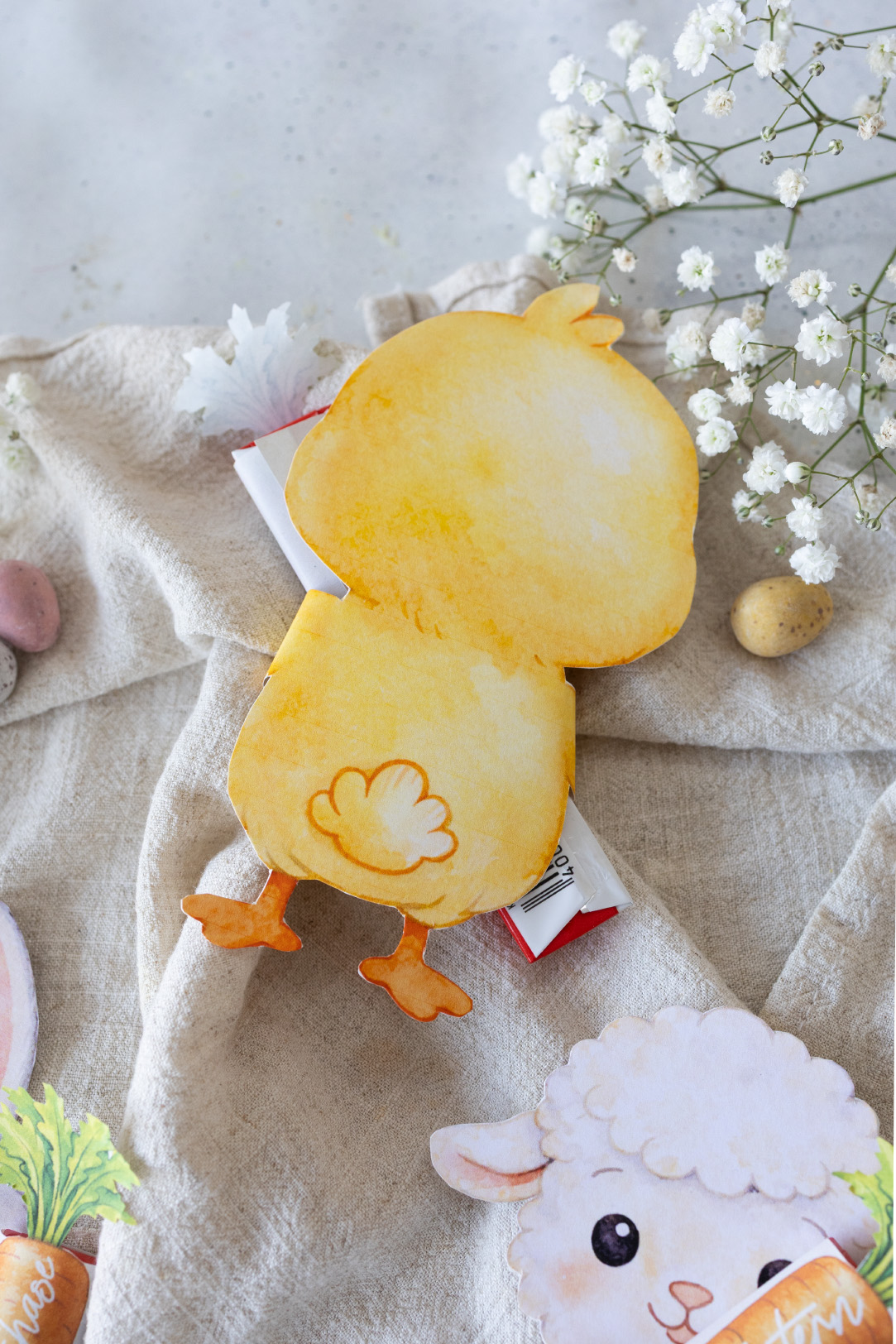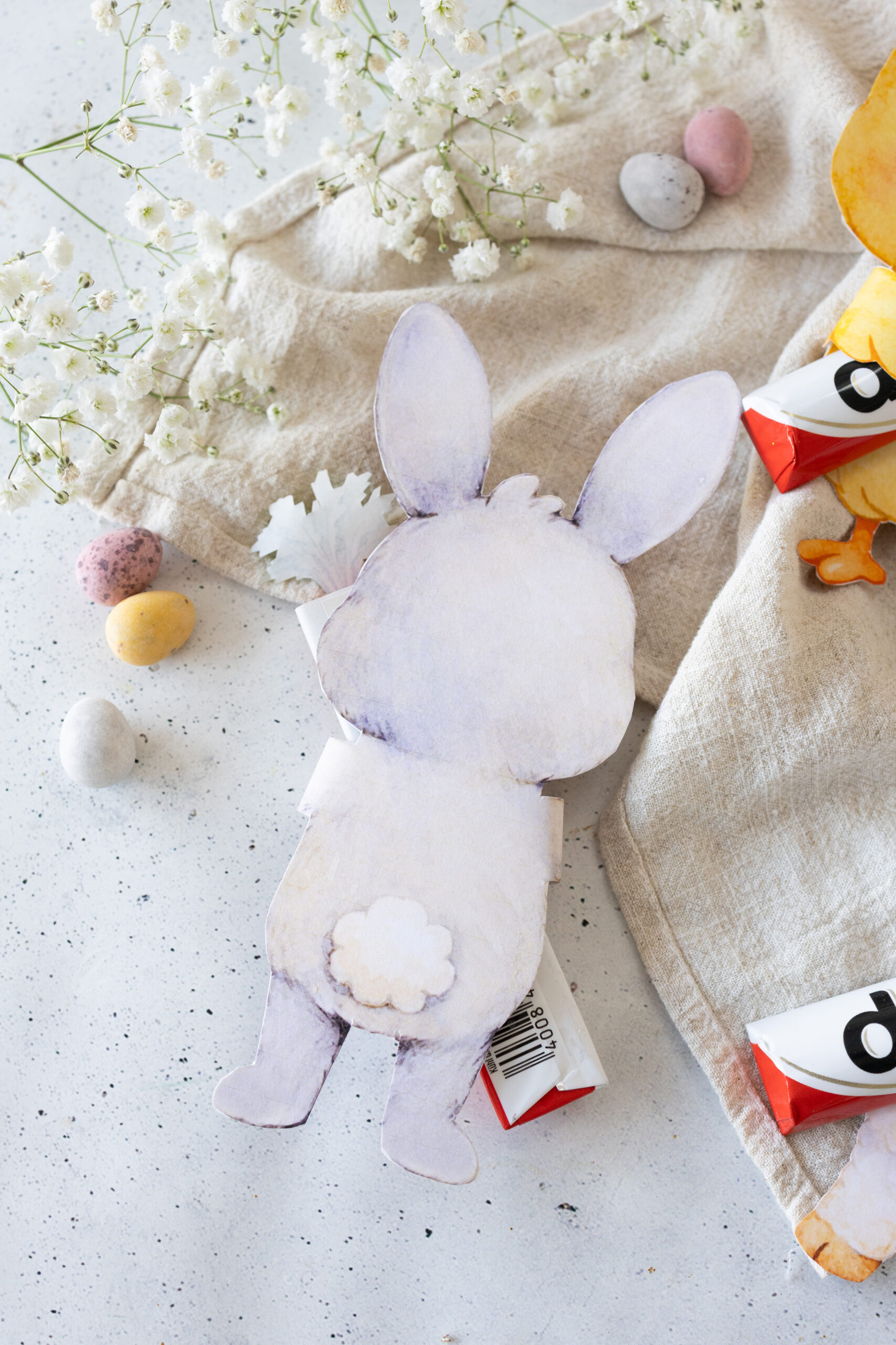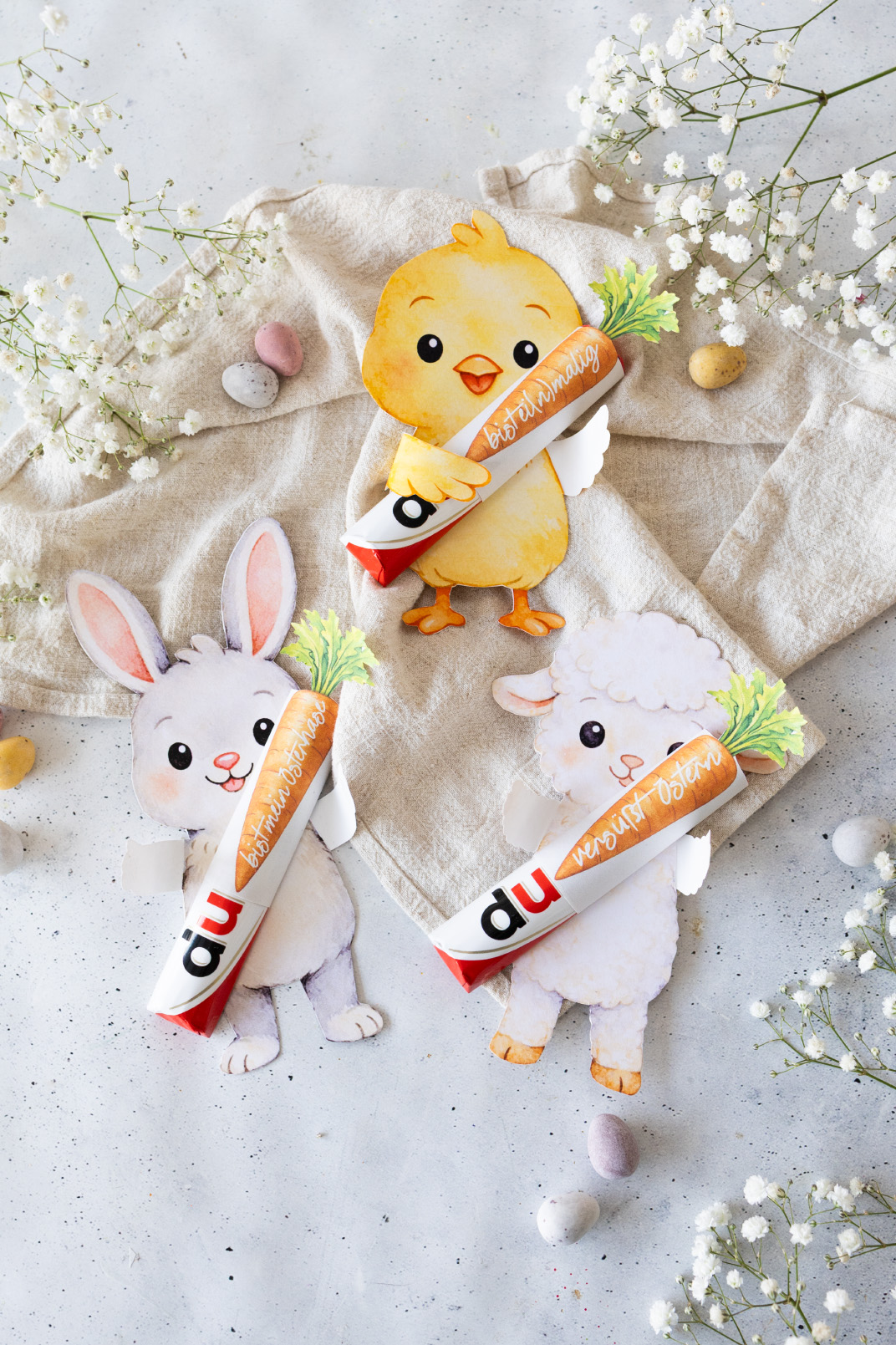 3 liebevoll gestaltete und farbige Figuren sowie Karotten Banderolen für Duplo-Riegel (Vorlage im PDF-Format)