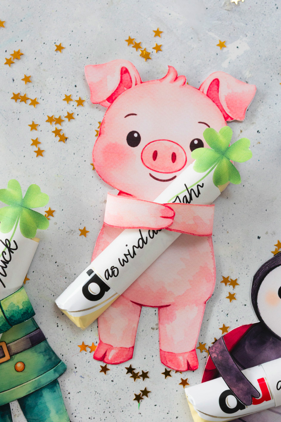 3 liebevoll gestaltete und farbige Figuren sowie Kleeblatt Banderolen für Duplo-Riegel (Vorlage im PDF-Format)