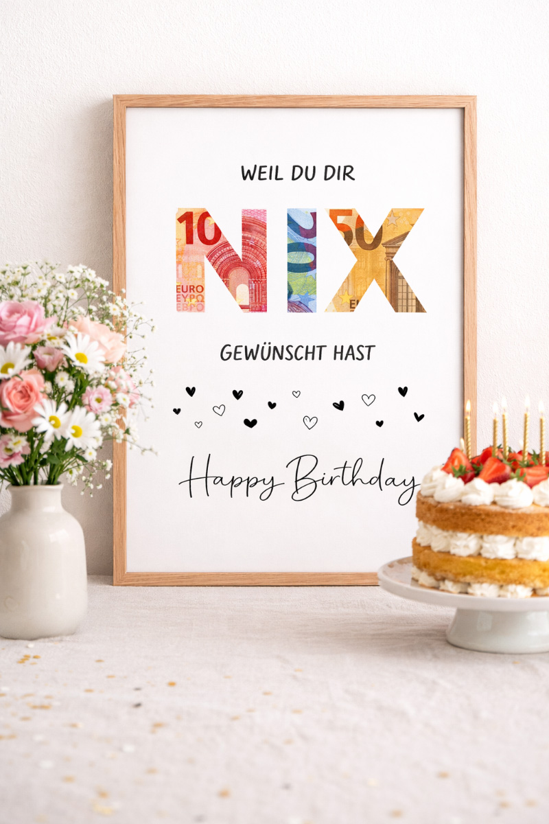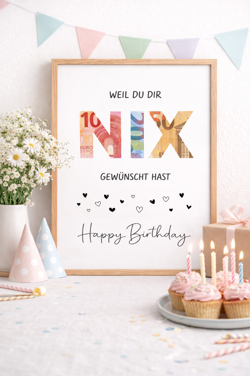 Geldgeschenk zum Geburtstag | PDF zum Ausdrucken | Last-Minute Geschenk | Ideal für den 18. 20. 50. 60. 70. Geburtstag | Wunscherfüller für eine Person, die sich nichts wünscht.