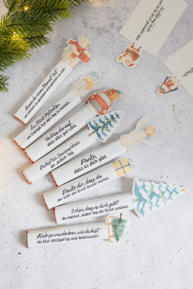 Zum Gestalten von einer Kinderriegel Verpackung und Riegeln mit Sprüchen für Banderolen, passend als Weihnachtsgeschenk oder kleine Aufmerksamkeit. Du kannst diese schönen Botschaften ausdrucken und dadurch ein schnelles Geschenk umsetzen. Zusätzlich kannst du am Hintergrund (die Winterkulisse) Geld oder einen Gutschein anbringen und verstecken.