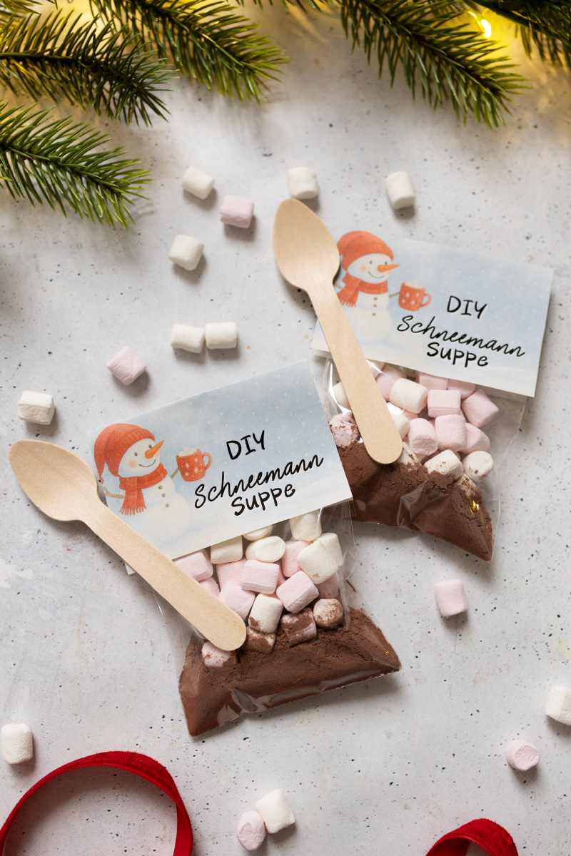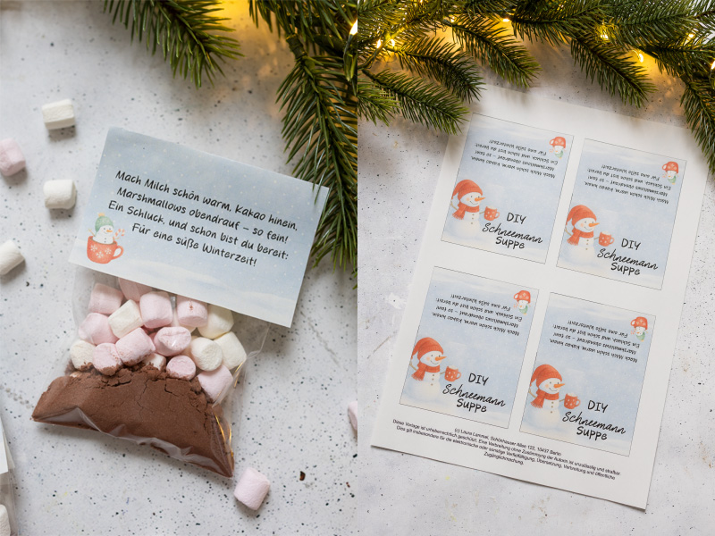 Zum Gestalten eines Weihnachtsgeschenks mit Marshmallows und Kakao für eine „Schneemann-Suppe“.
