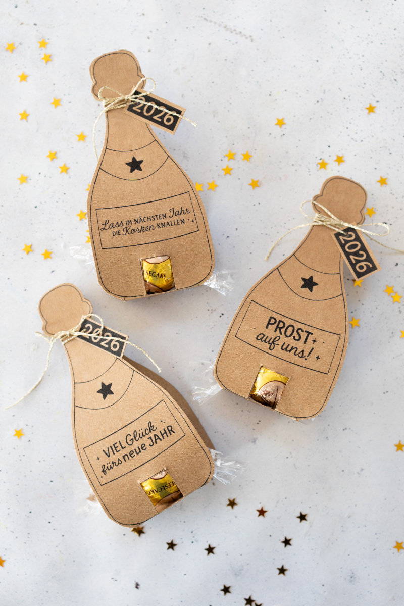 Silvester-Gastgeschenk: Diese festlichen Sektflaschen für Pralinen sind perfekt als kleines Dankeschön für Gäste, als Tischdeko an Silvester oder als Neujahrsgruß.