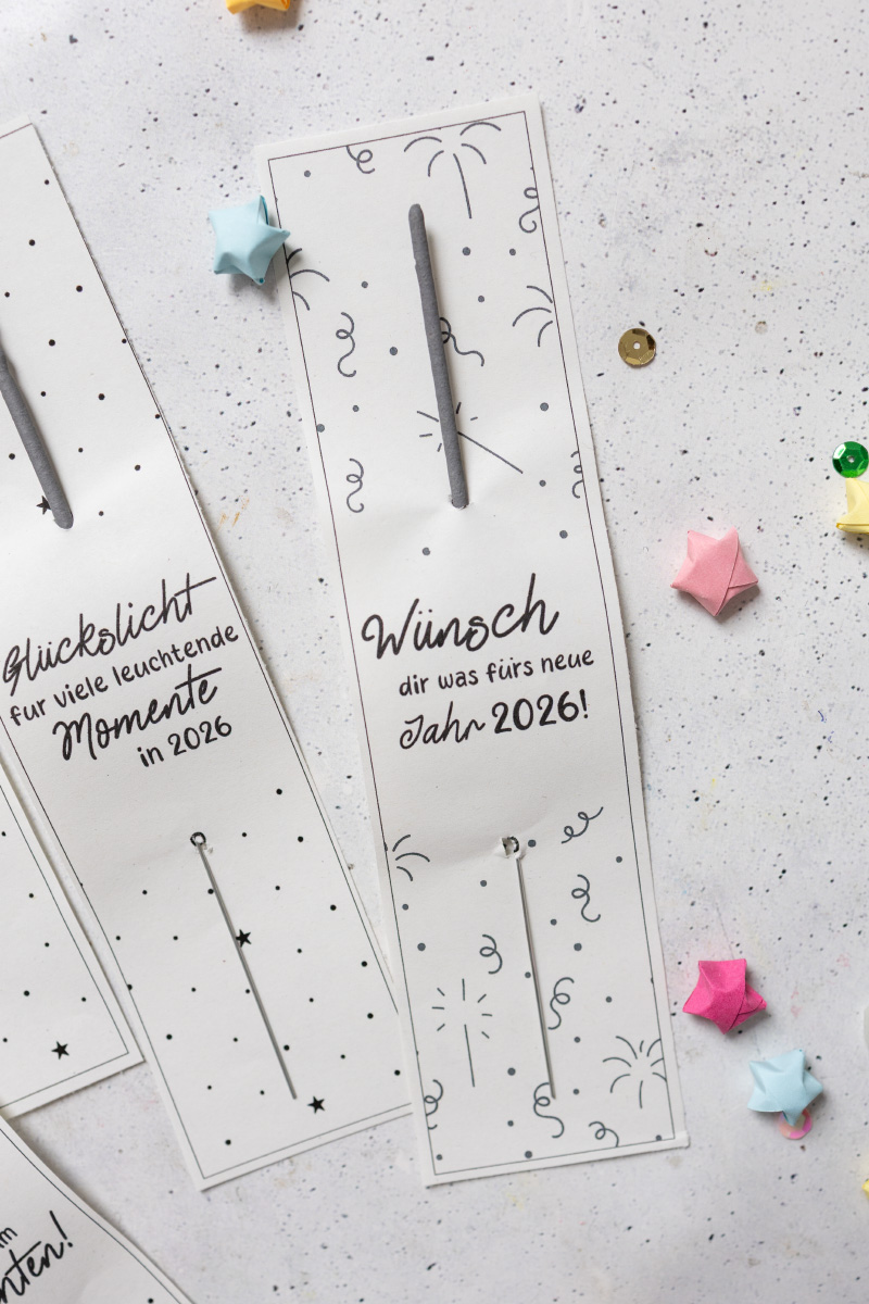 Diese Vorlage für Wunderkerzen zu Silvester ist die perfekte DIY Deko, um dein Neujahrsfest, Silvesterparty oder Jahreswechsel stimmungsvoll zu gestalten. Einfach ausdrucken, zuschneiden, Wunderkerzen einstecken – schon hast du personalisierte Silvester-Giveaways, kleine Geschenke oder Party-Favoriten für Gäste. Zum Gestalten von Silvester Wunderkerzen / Leuchtstäben / Knicklichtern als Glücksbringer, als kleines Mitbringsel, als kleines Geschenk.