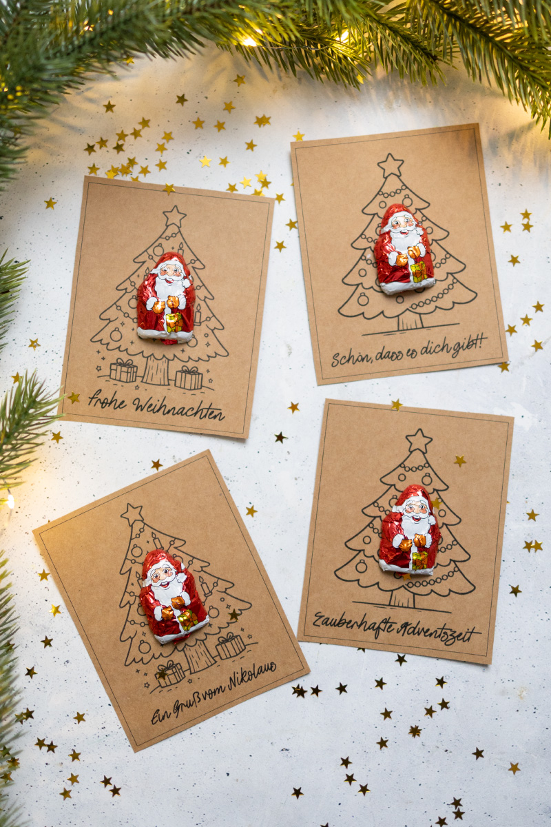 Zum Gestalten eines Weihnachtsgeschenk / Weihnachtstischdeko mit einer Tannenbaum-Verpackung für Schokoladenweihnachtsmännern.